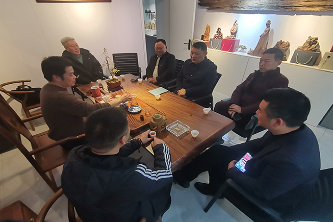 宁海县工艺美术行业协会会长蔡建祥对调研组的到来表示欢迎,并系统介绍了宁海工艺美术以雕刻、漆艺、编织等为代表的产业格局,汇报了近年来在产值提升、技艺传承与市场开拓方面的总体情况。两位专家委员会葛安飞大师和李和康大师结合自身领域,分享了在开拓线上销售渠道、实行租赁营销模式及推动产品设计创新等方面的实践与思考。